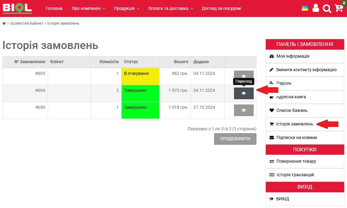 Увійти в особистий кабінет, вибрати розділ “Історія замовлень”.