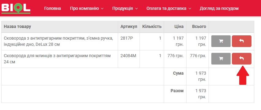 На товарі, який підлягає поверненню, натиснути піктограмку “Повернення товару”.
