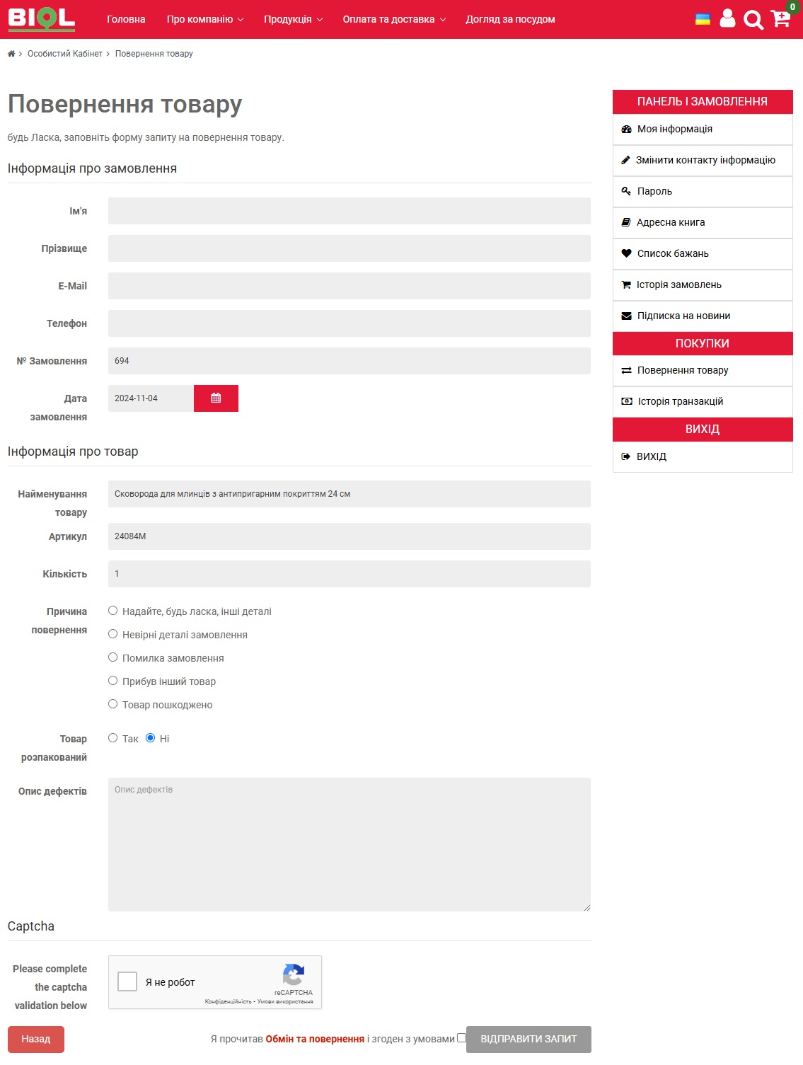 Заповнити поля для форми повернення товару: - Ім’я; - Прізвище; - e-mail; - Телефон; - Номер замовлення; - Дата замовлення; - Найменування товару; - Артикул; - Кількість; - Причина повернення; - При необхідності вказати опис дефектів; Натиснути кнопку “Відправити запит”. |