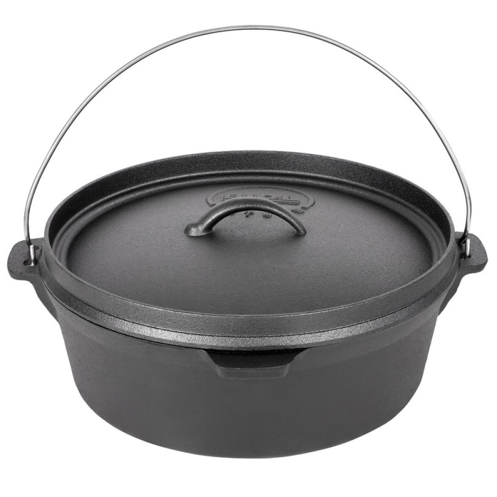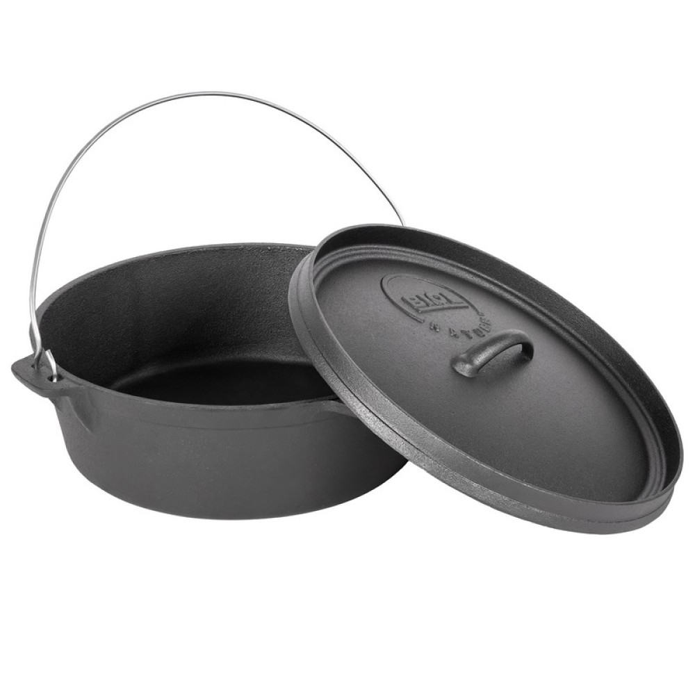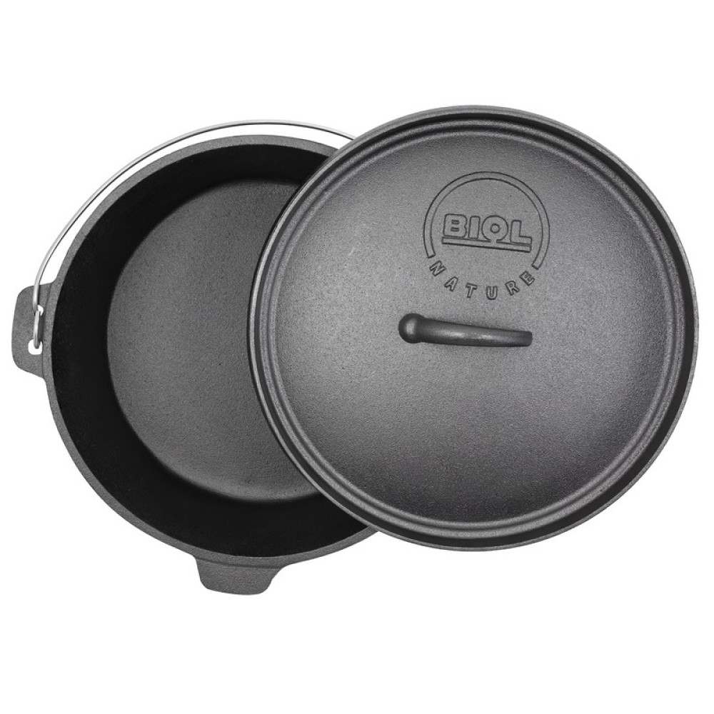 Литий чавунний котел з чавунною кришкою та дужкою від БІОЛ – це цілий кухонний комплекс, що дозволяє приготувати повноцінний обід, що складається з трьох-чотирьох страв навіть на відкритому вогні. У товстостінному котл...Литий чавунний котел з чавунною кришкою та дужкою від БІОЛ – це цілий кухонний комплекс, що дозволяє приготувати повноцінний обід, що складається з трьох-чотирьох страв навіть на відкритому вогні. У товстостінному котлі, виконаному з теплоємного чавуну, можна приготувати не тільки перші страви (навариста юшка, борщ і т.і.), але і плов, для якого важливий процес томлення, який забезпечує тільки чавун. Цей котел може замінити на природі навіть духовку, для цього необхідно покласти розжарене вугілля на кришку котла, адже її конструкція розроблена саме для цього, тим самим забезпечивши всередині котла нагрівання не тільки знизу, а й зверху, що сприяє рівномірному прогріву з усіх боків. Але конструкція кришки не обмежується лише цим. Перевернувши її і розташувавши над багаттям, вона перетворюється на дуже зручну сковороду-садж, яка ідеально підходить для приготування будь-яких страв на грилі.
